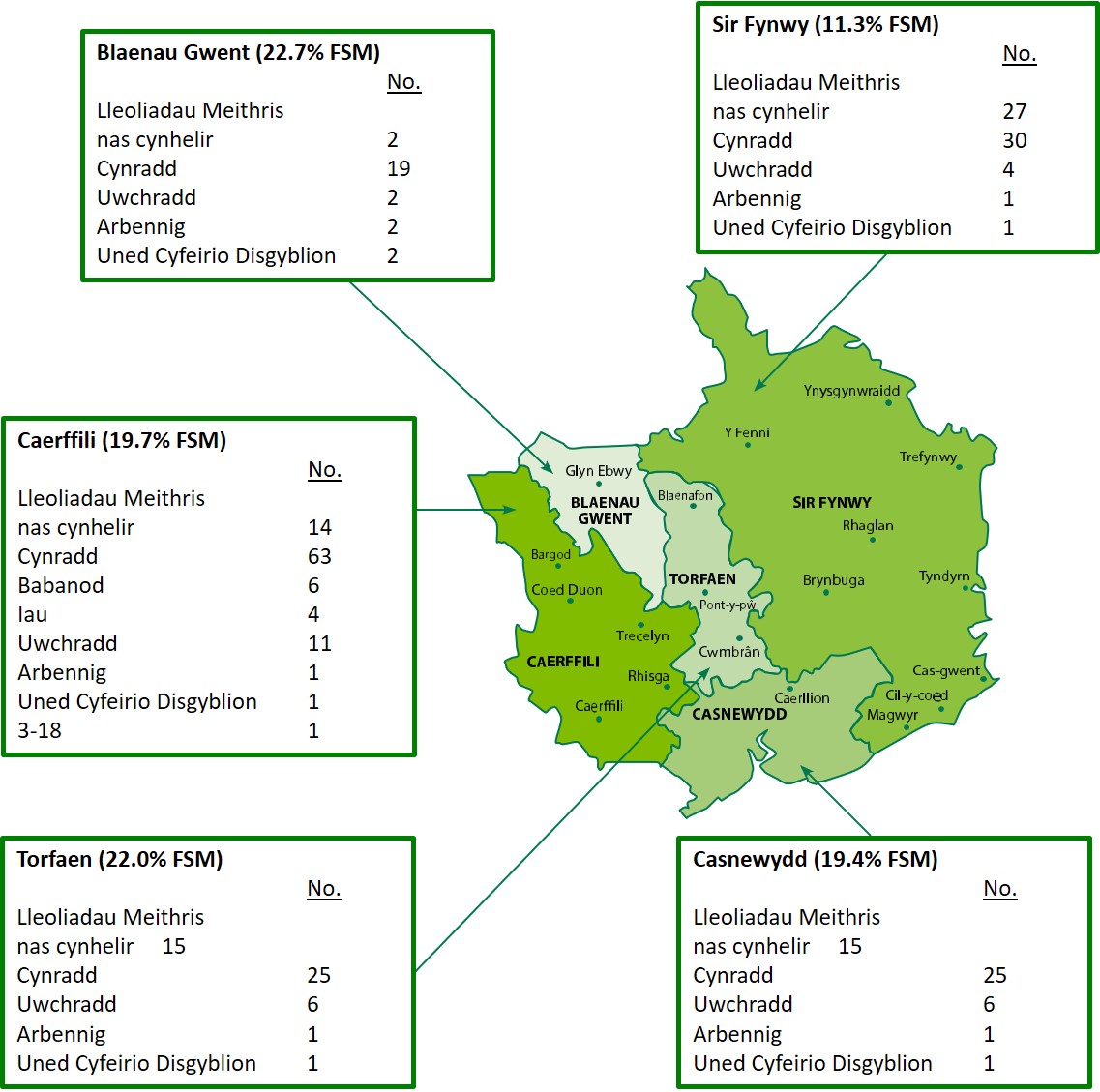 • Canran y disgyblion o oedran ysgol gorfodol sy’n gymwys i dderbyn prydau ysgol am ddim (PYDd) yw 19.2%, sy’n uwch na’r ffigur cenedlaethol o 18.3%. Y lefel hon o gymhwysedd yw’r ail uchaf ar y cyd o’r pedwar consortia rhanbarthol gyda Chonsortiwm Canolbarth y De (PLASC, 2019).