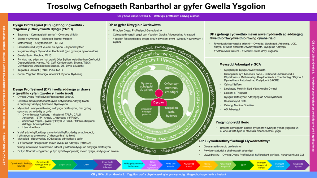 Yn ogystal â’r gefnogaeth y mae ysgolion yn cael mynediad iddi drwy eu Hymgynghorydd Herio, mae gan ysgolion gyfleoedd i gael mynediad i amrywiaeth o gefnogaeth drwy’r cynnig dysgu proffesiynol gan gynnwys cefnogaeth gan ymgynghorwyr pwnc, Ysgolion y Rhwydwaith Dysgu ar gyfer cefnogaeth sy’n benodol i bwnc a chefnogaeth ehangach ar gyfer arweinyddiaeth a llywodraethu.