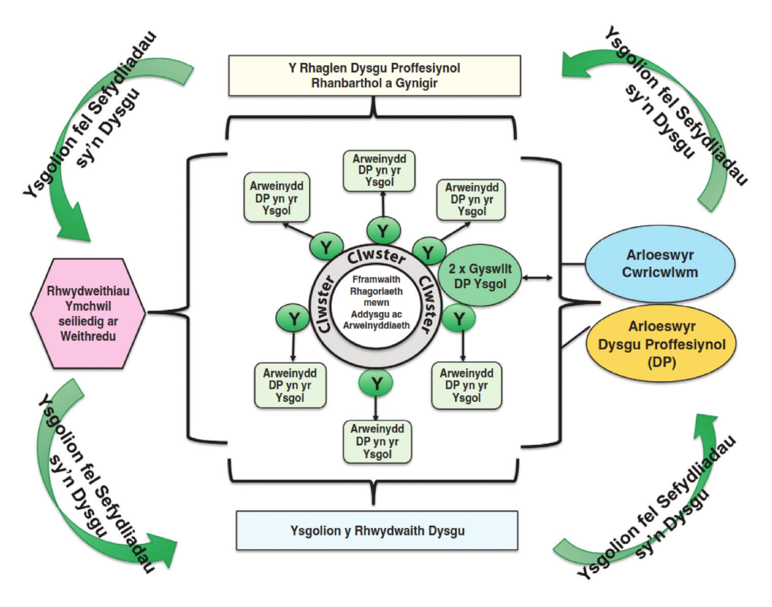 Mae cyfrifoldebau ac atebolrwydd yn newid o’r lleoliad canolog i’r lleoliad lle mae gwelliant yn digwydd, fel bod ysgolion yn rhannu atebolrwydd dros wella ysgolion eraill.