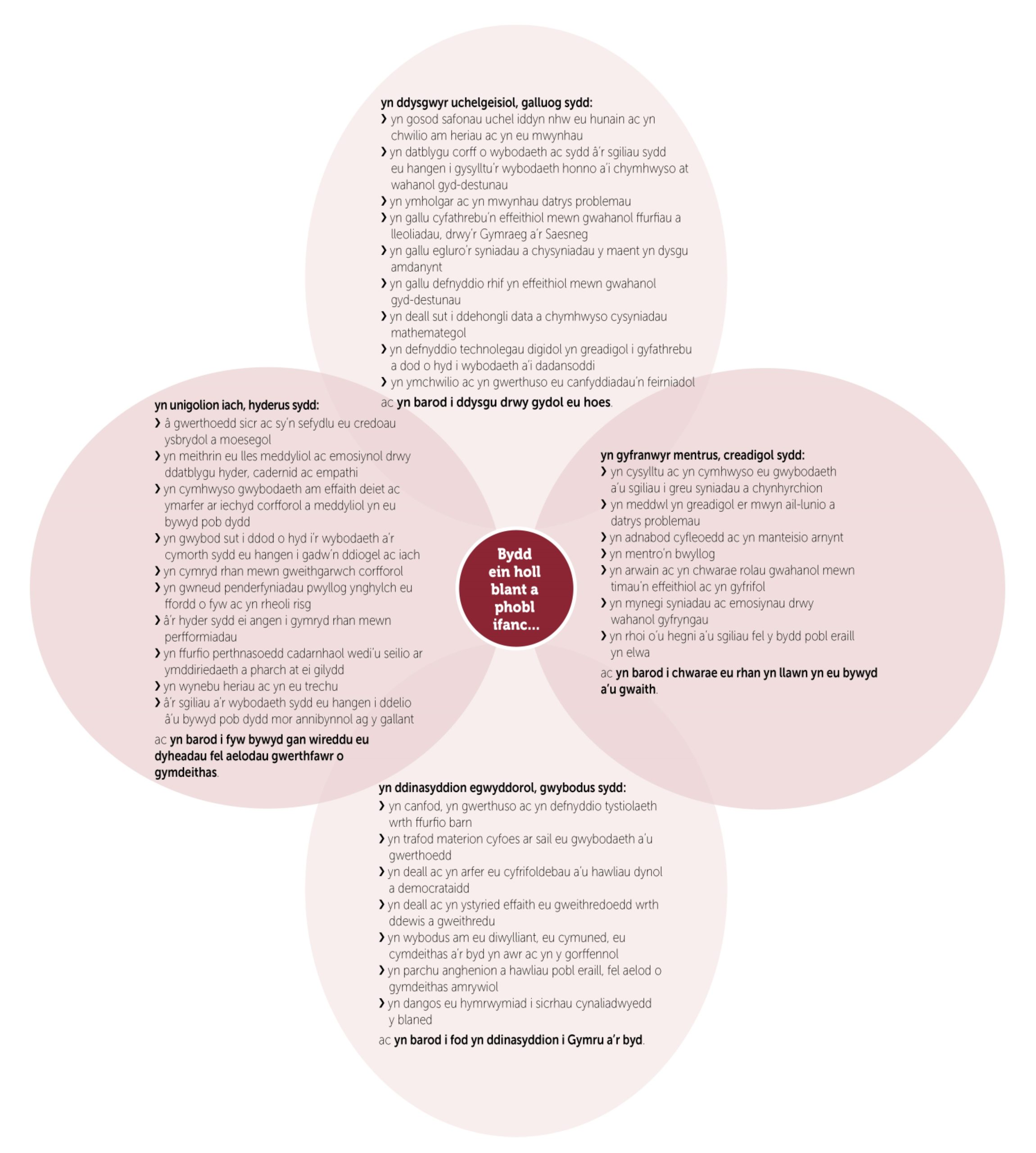 Bydd y cwricwlwm newydd yn dynodi ymadawiad sylweddol o adrifiadau blaenorol y Cwricwlwm Cenedlaethol oherwydd ei fod yn cael ei ddatblygu gan ddiben, sy’n golygu y dylai’r holl brofiadau dysgu gael eu cynllunio i gefnogi datblygiad pedwar diben (isod) mewn dysgwyr – mae’r Cwricwlwm wedi’i ddylunio i fod yn gontinwwm o ddysgu o 3-16 oed.