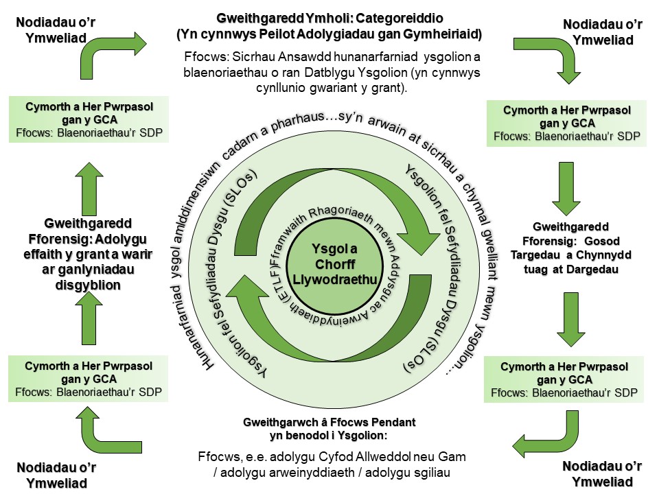 Yn ystod y flwyddyn, bydd triongliant o weithgareddau ar lefelau gwahanol o’r ysgol i ddatblygu ysgolion fel sefydliadau dysgu a sicrhau’r capasiti ar gyfer gwelliant cynaliadwy.